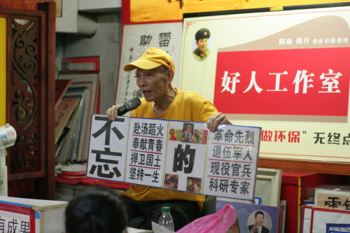 在交流环节,团队成员纷纷围拢曹老,分享聆听感悟并请教传承之道。曹老耐心解答,鼓励大家将雷锋精神融入日常生活,从身边小事践行奉献初心。与此同时,活动现场的另一大亮点 —— 小朋友们带来的金华道情表演《十杯香茶颂雷锋歌》正式登场。孩子们手握渔鼓、简板,以抑扬顿挫的唱腔和富有地方特色的方言,将雷锋故事娓娓道来。老人们随着节奏轻轻点头,部分熟悉道情的长者更是小声哼唱,现场氛围热烈。
