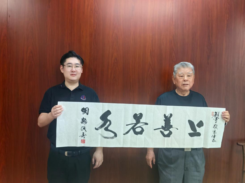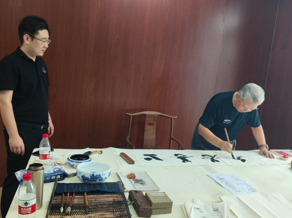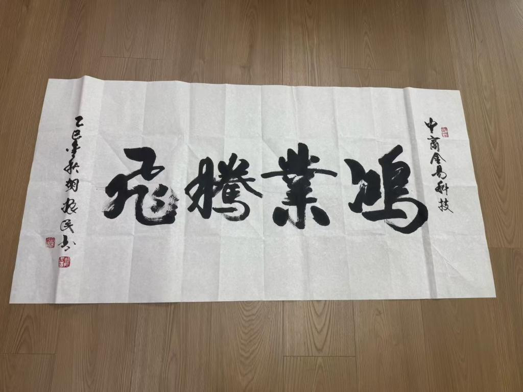 笔会现场,书画名家挥毫泼墨,以笔抒怀、以墨传情。一幅幅作品或苍劲有力,或清雅隽永,既展现了传统艺术的无穷魅力,也传递了与会者对家国情怀、社会和谐的深切寄望。胡振民部长在参观作品后指出,书画艺术是中华民族的文化瑰宝,其背后蕴藏着深厚的历史积淀与精神内涵。他还欣然提笔,为中商金易科技(海南)有限公司题写“鸿业腾飞”四字,寓意宏大的事业迅速崛起,快速发展;为刘李毅董事长题写“上善若水”,像水的品性一样,泽被万物而不挣名利。墨宝笔力雄健、气韵生动,寄托了对企业发展的殷切期望与文化担当的赞赏。